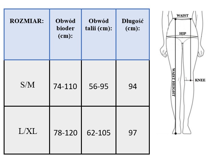 L/XL: talia 62-105 cm, długość 97 cm, biodra 78-120 cm