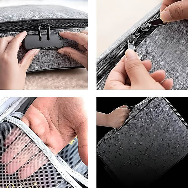 Martwisz się o bezpieczeństwo swoich ważnych dokumentów i kosztowności? Ta wodoodporna torba jest wyposażona w bezpieczny zamek szyfrowy, dzięki czemu dokumenty, pieniądze i biżuteria pozostają niedostępne dla innych osób.